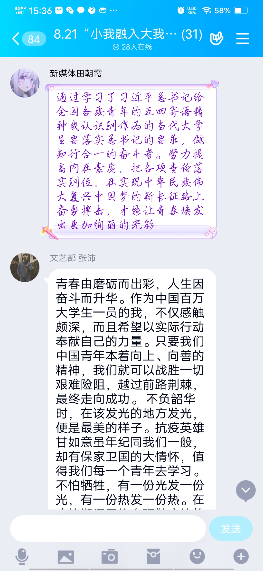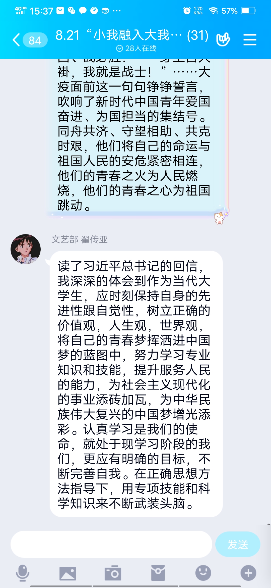 活动伊始,丁子怡同学带领大家共同学习了习近平总书记五四寄语、北京大学援鄂医疗队全体“90后”党员回信、复旦大学《共产党宣言》展示馆党员志愿服务队全体队员回信、中国石油大学(北京)克拉玛依校区毕业生回信精神、以及“习近平与老员工朋友们”系列访谈实录。然后同学们结合学习内容和社会实践,积极交流发言,纷纷发表自己对融入大我的看法。其中,赵雅诗同学表示“通过学习习近平总书记的寄语,我懂得了青春就是要奋斗,我们当代青年要继续发扬五四精神,以实现中华民族伟大复兴为己任,不辜负党的期望,民族的重托,不辜负这个伟大的时代”,李之龙同学表示“今年是决胜全面小康、决战脱贫攻坚,实现两个一百年奋斗目标的交汇之年,身为团员的一份子当然要继承和发扬五四爱国精神,坚定理想信念,始终保持艰苦奋斗的前进姿态”。最后,黄润芸老师对大家的观点进行总结,鼓励同学们要积极投身祖国建设,让青春为祖国绽放。